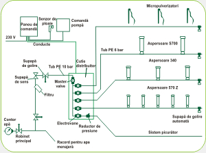Printr-o reţea invizibilă, montată în sol, apa ajunge la aspersoare, care se ridică la suprafaţă numai în timpul stropirii. Astfel sistemul nu limitează activităţile curente. Panoul de automatizare uşor programabil comandă cu precizie prin electrovane stropirea secvenţională, asigurând apa necesară diferitelor zone. |